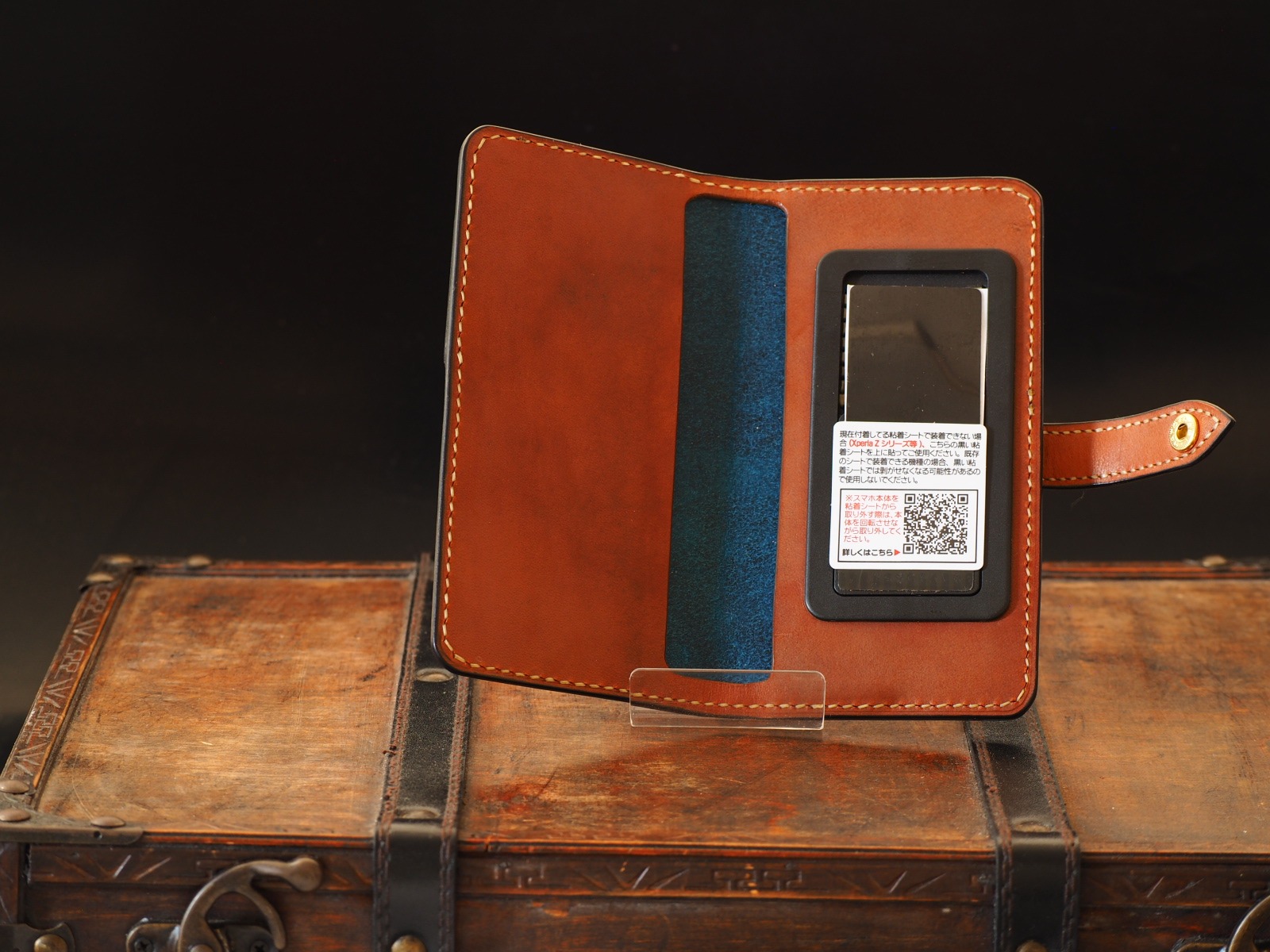 フルベジタブルタンニンレザーの本ヌメサドルを使用したスマートフォンケース。